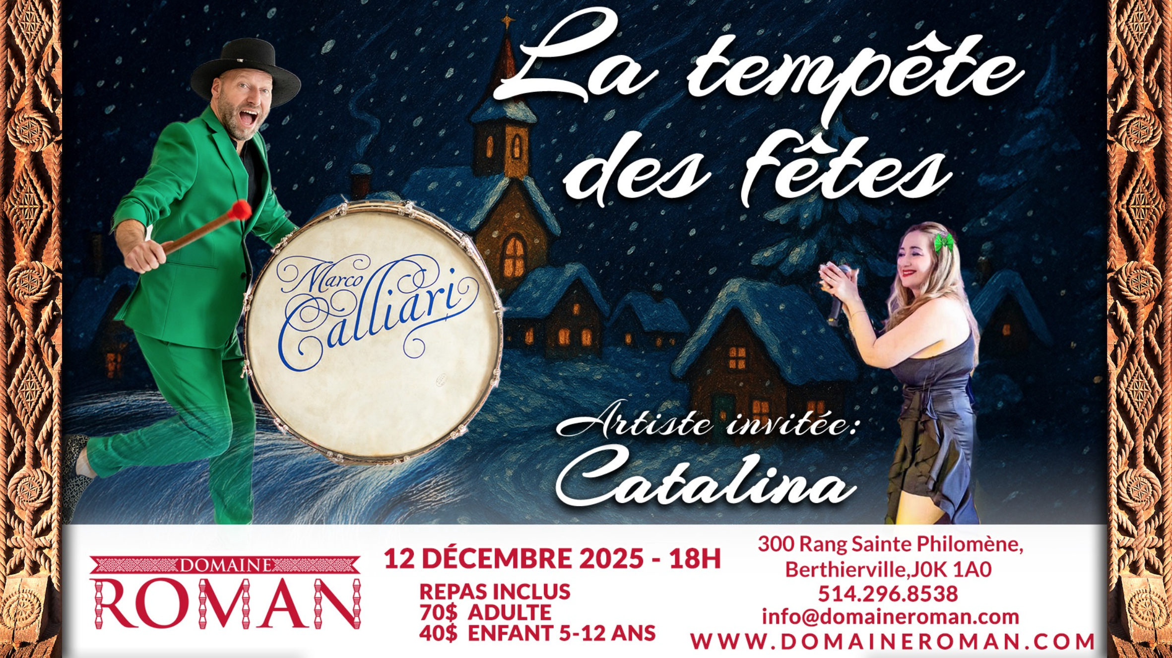 La Tempête des Fêtes est un spectacle festif où les traditions d’ici et d’ailleurs se rencontrent dans une explosion de rythmes et d’émotions. Une véritable tornade musicale s’abattra sur la période des Fêtes alors que Marco Calliari partagera la scène avec Mamselle Ruiz, Shauit ainsi que des musiciens déjantés.